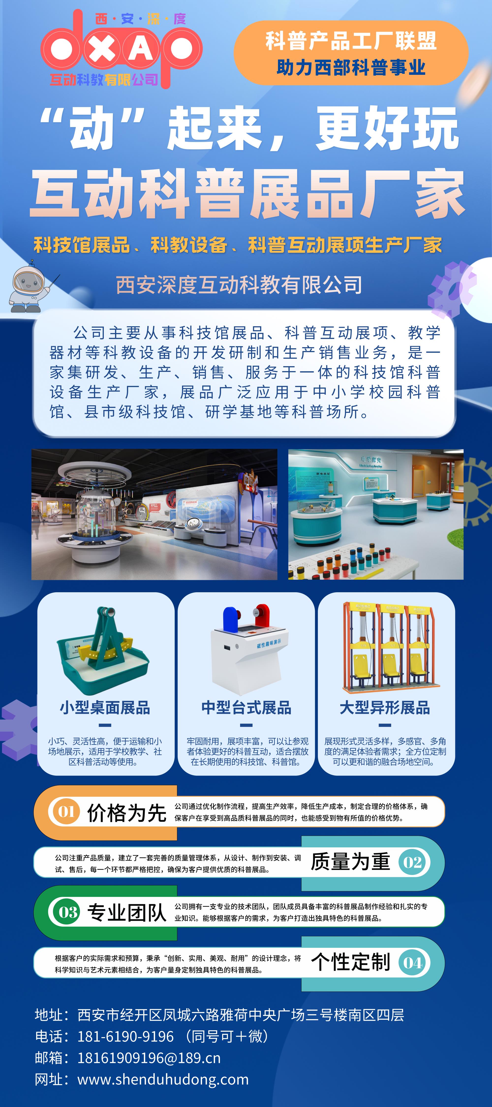 產品詳細介紹西安深度互動科教有限公司坐落于西部科教中心-陜西省西安市,是一家集科研開發、生產、銷售、整館設計于一體的生產型企業。公司專注于為各類科普類場館提供內容建設全過程服務,展品主打“互動性”,現已經成功研發了包括力學、聲學、電學、磁學、數學、人機交互等展項,涵蓋基礎科學,生命健康、低碳環保、防震減災、公共安全、人文等多個領域。通過科學性、知識性、互動性相結合的展覽內容和參與互動的形式,激發受眾對科學思想、科學方法的學習、研究、探索的興趣,從而提高科學文化素養。 公司生產基地引進國內外數臺大型加工機械,實行生產銷售加工一條龍服務。提供各類定制化科技展品設計研發制造,實現客戶定制化需求,并對各類場館建設實施一站式服務體系。公司匯集了機械結構設計、電子電路、機械電子、多媒體軟件、展陳設計、工程管理、多媒體制作等多領域人才,專業從事地市級科技館、社區科技館、校園科技館及各類主題科普館的布展建設。已為多地用戶提供了專業的科普館策劃、設計及展品研發服務。 |