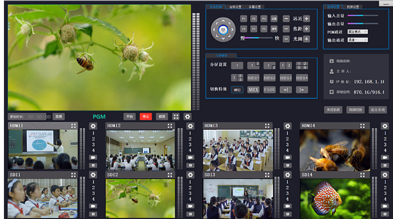 大屏輸出 通過 HDMI 接口輸出 PGM 合成通道的全屏視頻顯示,支持單畫面、多畫面分割顯示 1/2/3/4 分屏顯示?深A設分屏模式位置圖像大小功能。 界面輸出 支持硬件 HDMI 接口輸出系統操控界面,方便本地實時操控。