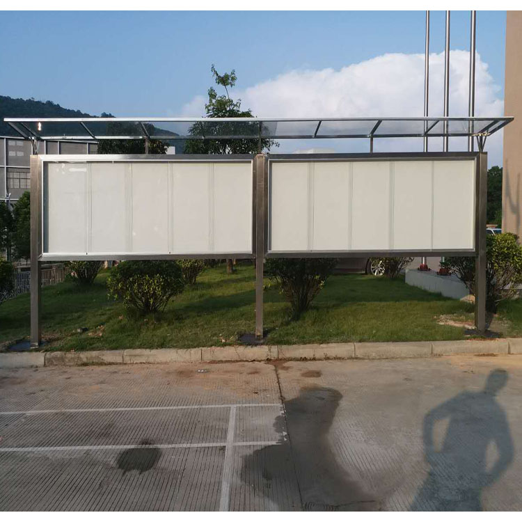 戶外不銹鋼宣傳欄特點: 1. 采用進口樹脂環保磁性白板漆烤制而成,金屬板作為基層,表面平滑易寫,沒明顯紋路,可以將紙張用磁粒吸附到板面,留言簡單。 2. 板面光滑平整,書寫流暢,持久耐用,擦寫不費力,亦可投影,讓辦公更輕松。 3. 不銹鋼邊框強度高韌性大,視覺美觀,高檔大方,易清潔,抗刮痕。 4. 厚度0.27MM的鍍鋅底板,防潮性能好。 5. 5MM玻璃門,輕易推拉,可保護宣傳欄里的資料,防風,防水。 6. 圓形厚實支撐柱,支撐力度強,高檔美觀。 7. 帶弧形不銹鋼支架實芯陽光板雨蓬,美觀大方。