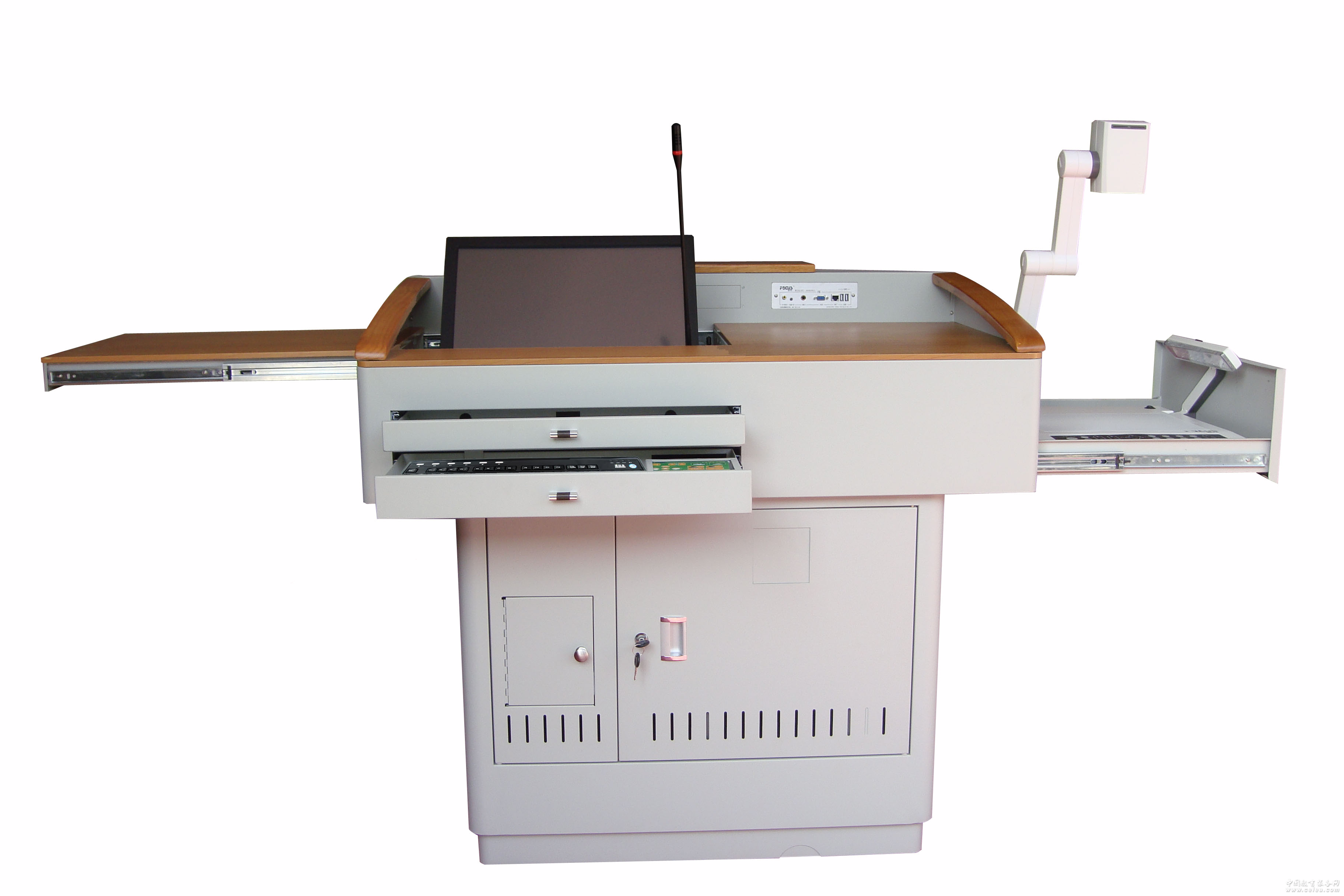 產(chǎn)品詳細(xì)介紹參數(shù): 1、知識產(chǎn)權(quán):數(shù)位講桌擁有自主知識產(chǎn)品,獲得外觀設(shè)計(jì)專利認(rèn)證,專利號:ZL 2008 3 0039389.6 2、講桌設(shè)計(jì):采用分體式設(shè)計(jì),桌面部分和桌體部分自成一體,外置固定螺絲孔位,安裝簡單,方便進(jìn)出設(shè)計(jì)比較窄的教室門。獨(dú)立包裝,運(yùn)輸輕便。 2、講桌構(gòu)成:鋼木結(jié)合,桌面為防火板,防火、防塵、防水、耐刮花。LOGO裝飾板及扶手為海南橡木,高檔美觀,實(shí)用。 3、講桌材料:講桌主體采用1.5mm冷軋鋼板,其它部分采用1.2mm冷軋鋼板。 4、講桌尺寸:關(guān)閉時,長寬高(110*80*100)CM;展開時,長寬高(200*105*100 )CM。 5、人性化:無棱角,桌體拐角采用圓弧設(shè)計(jì),防止碰傷。提供實(shí)木扶手,方便老師扶握。 6、高度集成:講桌內(nèi)部可擴(kuò)充IC卡系統(tǒng),可內(nèi)置專業(yè)鵝頸話筒一只,兩只30W的多媒體無源音箱,可擴(kuò)充防盜報(bào)警系統(tǒng),可擴(kuò)充四只輪子,方便移動。 7、詳細(xì)配置: (1)、講桌配氣動輔助升降桿或者電動升降機(jī),可裝15寸、17寸、19寸、21.5寸液晶顯示器。 (2)、講桌配隱藏式滑軌抽拉抽屜,可容納鍵盤、中控控制面板。鍵盤架下方為儲物抽屜,可以放置書本,粉筆,粉擦等。 (3)、講桌桌體采用開合式小柜門設(shè)計(jì),不必打開桌子柜門,即可經(jīng)由計(jì)算機(jī)光驅(qū)播放光碟。 (4)、講桌左側(cè)具推拉式輔助臺板,可放置筆記型計(jì)算機(jī),承重8公斤。 (5)、講桌右側(cè)具有抽拉式抽屜,可放置實(shí)物展示臺,承重10公斤。 (6)、講桌桌子內(nèi)部采用機(jī)柜式標(biāo)準(zhǔn)設(shè)計(jì),帶隔板,中控及功放等設(shè)備可以固定安裝起來,其他設(shè)備可放在隔板上面,所有設(shè)備擺放整齊、美觀。 8、高檔紙箱包裝,抗摔,防壓。 |