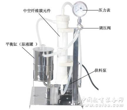 它是由中空纖維膜組件、供料泵、平衡缸、壓力表、調壓閥、環卡連節、插管接頭、硅膠管等組成。