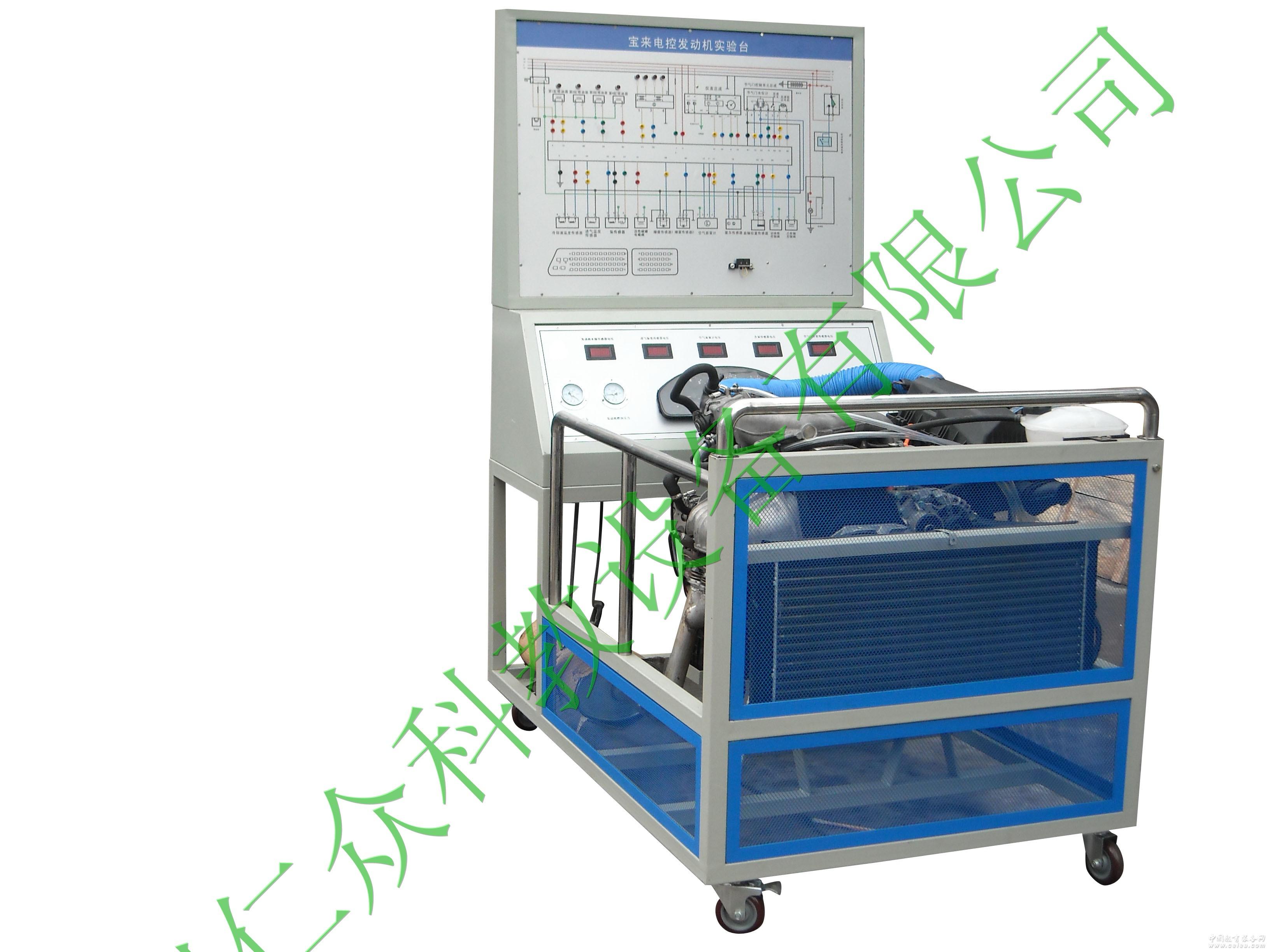 發動機總成和發動機控制單元、原車線束、儀表總成、冷卻液溫度傳感器、進氣溫度傳感器、節氣門控制總成、空氣質量計、氧傳感器、點火開關、整套散熱機構、汽油箱和汽油泵總成、蓄電池、五個數字電壓表、真空壓力表及燃油壓力表、帶有完整彩色電路原理圖面板、外接式檢測端子、智能故障設置盒總成、可移動臺架、使用說明書及實驗指導書。