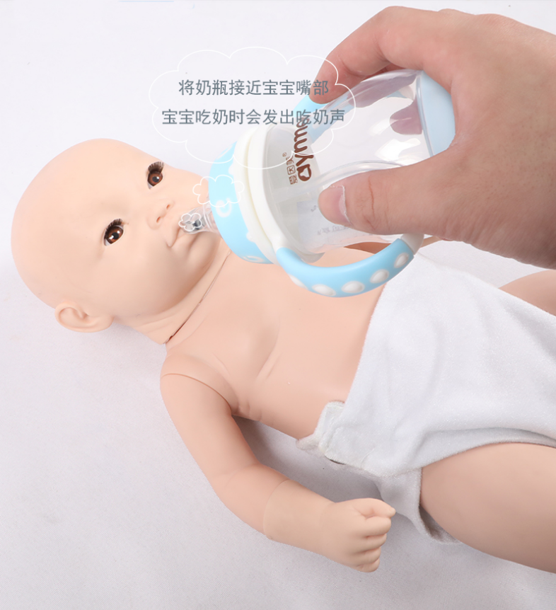 產(chǎn)品詳細介紹高智能嬰兒模擬人、高智能嬰兒互動照料模擬人 ZH/FT332 產(chǎn)品介紹: 高智能嬰兒模擬人造型逼真,適合護理和兒科臨床工作者及初為人父母的人們使用,可練習嬰兒日常護理所需的各種技能和技巧,設(shè)定6種不同場景以實施對嬰兒的不同護理需要。 一、功能特點: ■仿真嬰兒模型,采用高分子材料制成,膚質(zhì)仿真度高,四肢靈活。 ■模型尺寸:50×25×12cm(頭圍34cm、肩寬13cm、胸圍31cm、凈重約1.35kg)。 ■娃娃設(shè)有6種不同照護模式(正常、饑餓、過飽、尿濕、發(fā)熱、恐懼),不同場景的設(shè)置能夠模擬出真實狀態(tài)下嬰兒的表現(xiàn)特征,各模式可自動循環(huán)或在某些操作完成后相互切換。 ■在不同的場景下可通過測肛溫、喂奶、愛撫、更換尿布、擦浴等操作使其進入其他狀態(tài)。 ■開、關(guān)機:按下左手開機鍵,寶寶進入安靜的正常狀態(tài),會發(fā)出“呀”音,提示開機狀態(tài),在開機狀態(tài)下任何時候再次按下左手開機鍵,則自動關(guān)機。 ■喂奶:將奶瓶接近寶寶嘴部,寶寶吃奶時會發(fā)出吃奶聲。 ■更換尿布:將配套的尿布通過腰部兩側(cè)的按扣固定在寶寶小屁股上或?qū)⒛驖竦哪虿既∠隆?br/>■敷冰袋:將冰袋敷在寶寶額頭一分鐘左右。 ■生命體征測量: • 脈搏測量:按住寶寶左手脈搏鍵約5 秒后會自動報出脈搏頻率。 • 體溫測量:將體溫計插入肛門約10 秒后拔出會自動報出體溫值。 ■與寶寶交流: 1、正常模式:撫摸寶寶頭部會發(fā)出隨即呀呀聲;撫摸寶寶背部發(fā)出笑聲;將奶瓶接近嘴部時發(fā)出吃奶聲。 2、饑餓、尿濕、發(fā)熱、恐懼模式:寶寶會哇哇大哭這時候需要判斷寶寶哭鬧原因并及時給予正確的護理方能使寶寶安靜下來,護理操作包括:喂奶、換尿布、敷冰袋、輕輕安慰寶寶。 • 饑餓模式:應及時喂奶,若寶寶沒吃飽便移開奶瓶后寶寶繼續(xù)發(fā)出哭聲,直至吃飽(大約需150 秒)。 • 尿濕模式:應及時更換尿布。 • 發(fā)熱模式:體溫脈搏會持續(xù)上升,此時應及時敷冰袋,敷冰袋持續(xù)一分鐘后寶寶會停止哭聲,脈搏和體溫持續(xù)下降,直至恢復正常狀態(tài)。 • 恐懼模式:輕輕多次撫摸嬰兒頭部或背部后哭聲會逐漸減少,直至恢復正常狀態(tài)。 3、過飽模式:此時喂奶寶寶會發(fā)出聲音表示“我吃飽!”拍打或撫摸背部時寶寶會發(fā)出打嗝聲。 二、標準配置: ■高智能仿真娃娃:1個 ■配套場景識別奶瓶:1個 ■說明書:1冊 ■保修卡合格證:1張 ■包裝尺寸:55x38x20cm ■毛重:3kg