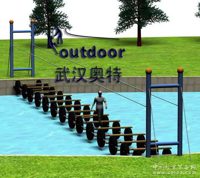 拓展器材產品介紹:水面上由輪胎與木板搭建的上下起伏的趣味橋。
