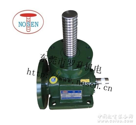 NOSEN螺旋升降器規格: 05T,1T,2T,3T,5T,10T,15T,20T,30T,50T,100T 產品系列: RN-RNF-RNK-RNE-RNT-RNS-RNV NOSEN機械升降動作結構新運用 螺旋升降器最早在臺灣為機械上附屬附件,制成系列產品成為商品化市場。以其獨特的外形,精巧的設計,緊湊的結構廣泛地運用于機械、冶金、建筑、化工、醫療、文化衛生等各個行業。成功地解決了一些機械升降動作中定位難,安裝設計不方便的問題。且帶動機械行業在部品附件總成上的應用,提供機械設計方便性和實用性,在傳動性市場上已蔚成風潮。 螺旋升降器結構主要為機身、入力蝸桿、含內螺紋之銅件蝸齒輪及其它附件組成。主設計規范上從0.5噸至100噸,有多種規格。其動態承受力從0.3噸至26噸,舉升速度可達3600mm/min。螺桿端在應用上又可分為頂板式、栓孔式、牙口式、平口式(標準型)四種,并可依客戶要求加工螺桿端。