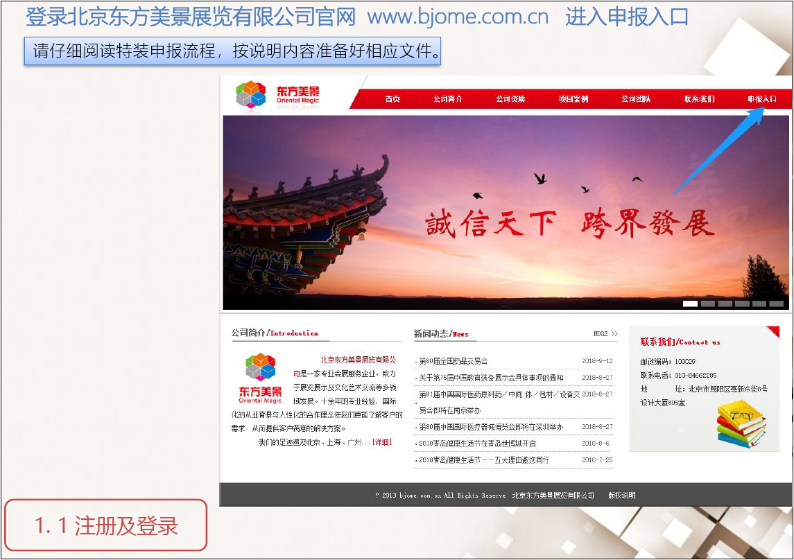請搭建商登錄 北京東方美景展覽有限公司官方網站:www.bjome.com.cn 進入申報入口進行申報并繳費完成