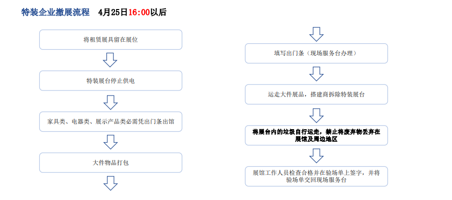 - 提示:每天閉館前,請自覺處理好展位內的物品(重要資料可打包寄存或帶走,貴重物品請隨身攜帶),以免丟失,撤展期間尤其要重視。