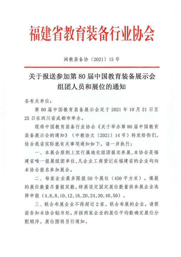 福建省教育裝備行業協會關于報送參加第80屆中國教育裝備展示會組團人員和展位的通知