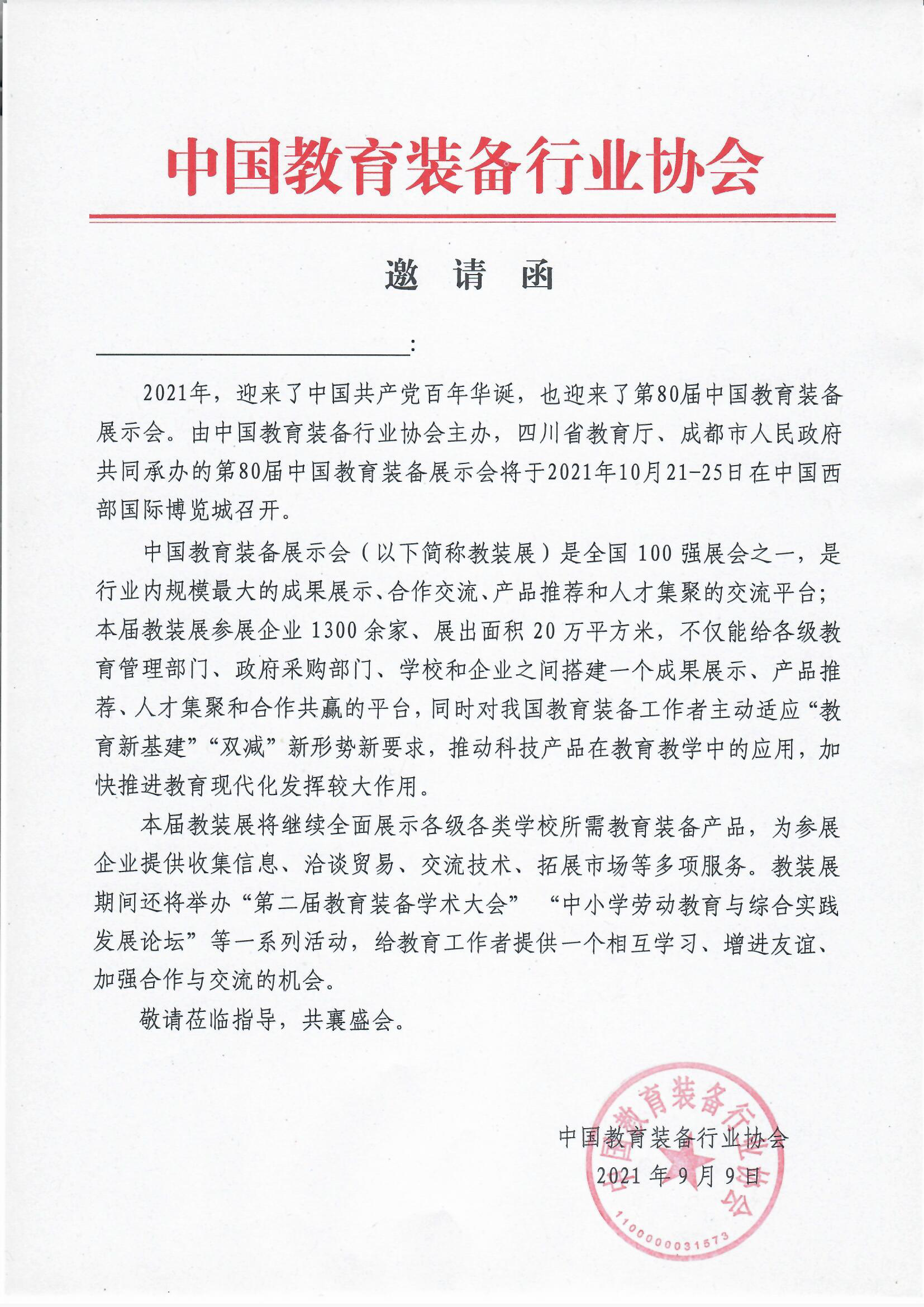 主辦單位:中國教育裝備行業(yè)協(xié)會展會時間:2021年10月21日-25日展會地點:中國西部國際博覽城