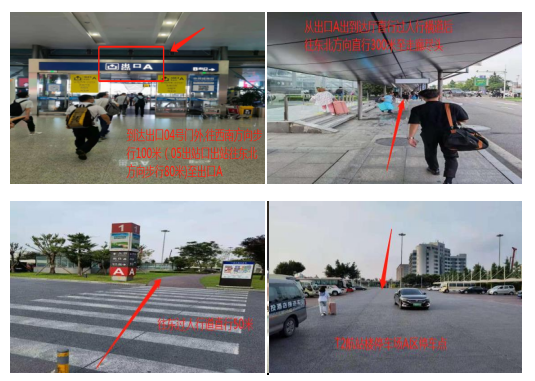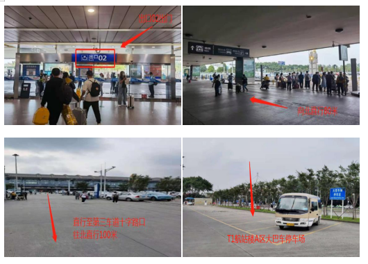 2. 乘車路線指引:從04或05號到達出口出來后在接站大廳從“出口A”出門,直行過人行橫道后往東北方向直行300米至走廊盡頭,往東過人行道直行50米到達T2航站樓大巴A區停車場。