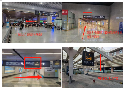 乘車路線指引:下火車后從西廣場出口出站,出站后往南進入右側旅游大巴通道直行100米后向西上扶梯直行100米,過人行橫道至成都東站大巴停車區。