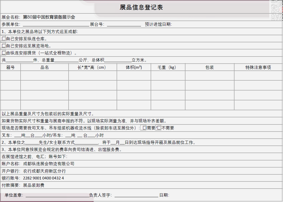請參展商以現金、微信、支付寶、銀行轉賬、POS機等方式支付成都縱連展會物流有限公司有關費用。所有展品運費須在展覽會撤展前結清費用,否則不予辦理出館手續,由此產生的一切額外費用由參展商自行承擔。