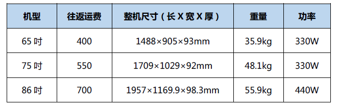 交互智能平板設備單臺往返運費及設備規格(加壁掛厚度增加30mm)如下:
