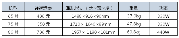 交互智能平板設備單臺往返運費及設備規格(加壁掛厚度增加30mm)如下: