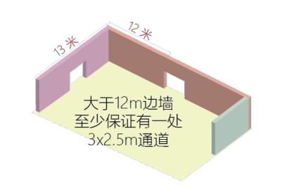 2.展臺設計大于12m的邊墻至少保證有一處3X2.5mH的通道口,請參考下圖示例。如展位邊墻靠近主通道,可將開口位置放置展位通道邊,無須在邊墻中間開口。