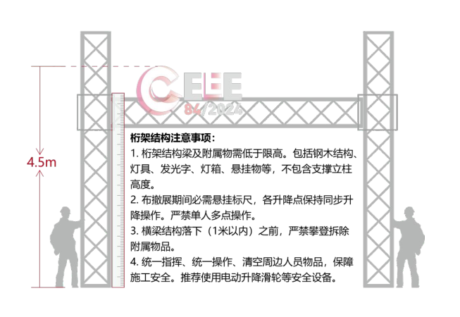3.展臺搭建限高:4.5米;全館禁止搭建雙層結構或超高展臺,無懸掛物背板厚度不得少于20CM,龍骨間距不得大于40CM;桁架結構展臺高度以及施工標準請參考下圖。
