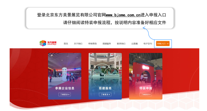 請(qǐng)搭建商登錄北京東方美景展覽有限公司官方網(wǎng)站:www.bjome.com.cn進(jìn)入申報(bào)入口進(jìn)行申報(bào)并繳費(fèi)完成。