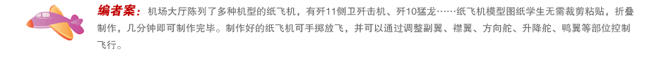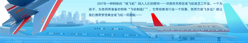 濟南市天橋區紙飛機紙藝工作室所制造的紙飛機的銷售對象不僅是孩子,還有一些成人。他們有的在紙飛機上尋找樂趣,有的是老師作為教學基本模具,讓孩子了解更多知識。紙飛機的制作過程很簡單,可以自己動手完成。大人們可以在制作的過程中找回童年的樂趣,孩子們可以通過紙飛機模型的仿真特點了解空氣動力布局、空氣動力原理和飛機控制原理等理論知識,通過投擲紙飛機模型在實驗中驗證這些理論知識。一般這樣一個紙飛機只需要5分鐘左右就可以制作完成,孩子們可以在在享受樂趣的同時可以通過安裝的每個部件形象、快速的獲取相關知識。